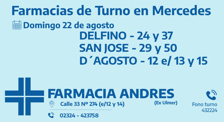 Desde las 8:30 del día de hoy, hasta la misma hora de mañana, las farmacias de turno en Mercedes son: Delfino, San José y D’Agosto.