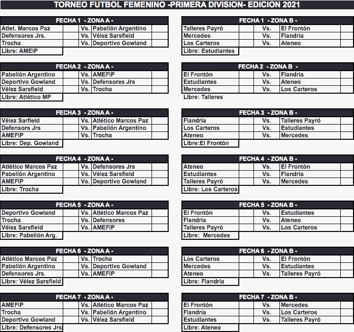 La Liga Mercedina de Futbol dio a conocer el fixture del torneo de Primera División para el Futbol Femenino. Participarán 14 equipos que comenzarán a competir el 4 de septiembre. Se dividió en dos zonas. La Zona A la integran Trocha, Vélez Sarsfield, Defensores Junior, AMEFIP San Martin, Deportivo Gowland, Pabellón Argentino de Marcos Paz y Atlético Marcos Paz. En tanto, la Zona B la integran Club Mercedes, Ateneo, Estudiantes, Los Carteros, Talleres Payró, El Frontón de San Andrés de Giles y Flandria.