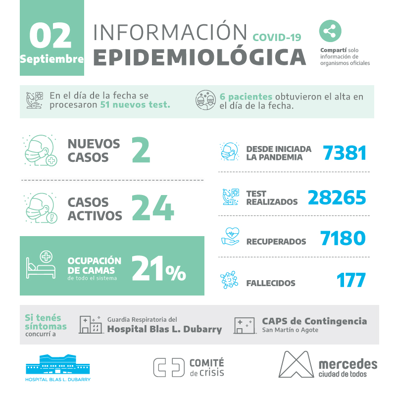De acuerdo al informe enviado por las autoridades sanitarias de Mercedes, este jueves se registraron 2 casos positivos entre 51 análisis realizados. Asimismo, informaron que el número de dosis aplicadas de la vacuna contra el covid-19 es de 76.078.