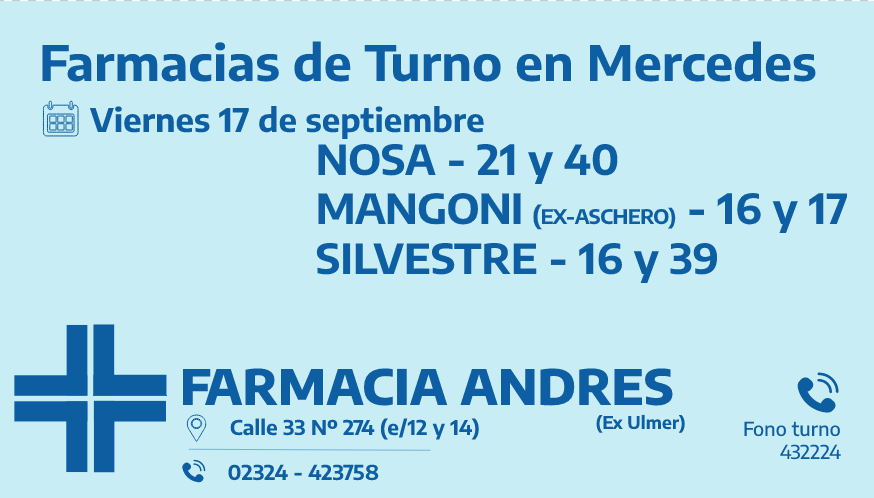 Desde las 8 30 del día de hoy hasta la misma hora de mañana las farmacias de turno en Mercedes son: Nosa, Mangoni y Silvestre.