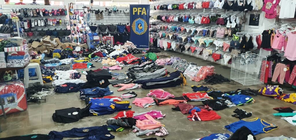 La División Unidad Operativa Federal Mercedes de la Policía Federal Argentina procedió a dar cumplimiento al mandato Judicial, el cual ordenaba el allanamiento de dichos comercios, logrando incautar más de 1500 prendas de vestir y más de 160 pares de calzados con diferentes inscripciones, dicha mercadería tiene un valor aproximado de mercado de $8.300.000 pesos, informan desde la fuera policial federal con asiento en nuestra ciudad.