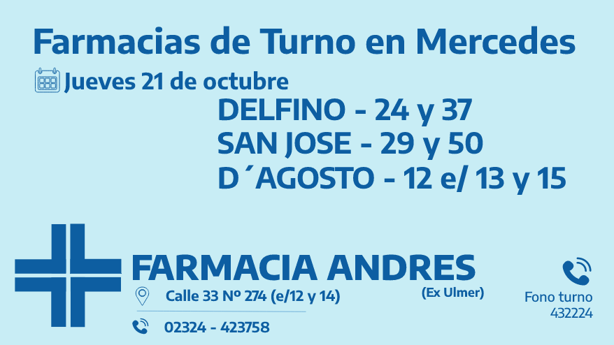 Desde las 8:30 del día de hoy hasta la misma hora de mañana, las farmacias de turno en Mercedes son: Delfino, San José y D’Agosto.