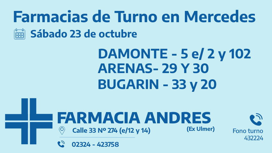 Desde las 8:30 del día de hoy, hasta la misma hora de mañana, las farmacias de turno en Mercedes son: Damonte, Arenas y Bugarín