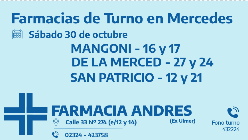 Desde las 8:30 del día de hoy hasta la misma hora de mañana las farmacias de turno en Mercedes son: Mangoni, De la Merced y San Patricio.