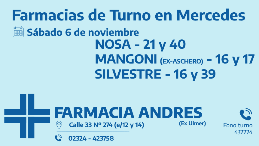 Desde las 8 30 del día de hoy hasta la misma hora de mañana las farmacias de turno en Mercedes son: Nosa, Mangoni y Silvestre.
