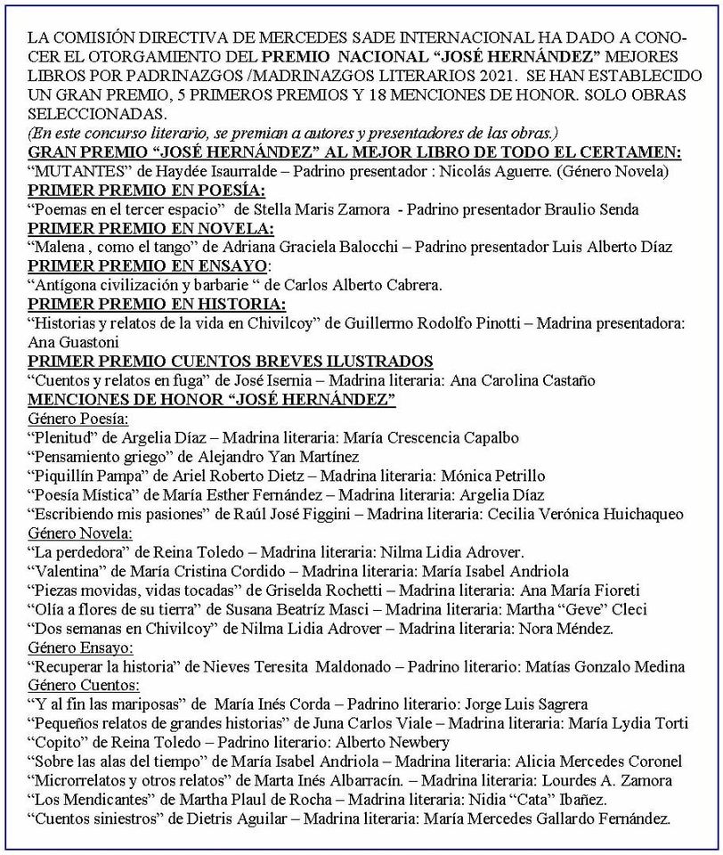 Desde SADE Mercedes informaron que este viernes 12 de noviembre, a partir de la hora 15 y hasta las 18, en La Pulpería de Cacho Dicatarina se hará entrega de los Premios Nacionales «José Hernández» 2021 a la literatura. Son seis trofeos y 50 diplomas de honor lo que se entregará en un acto presencial.