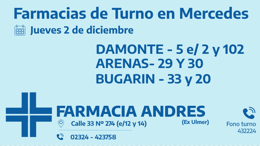 Desde las 8:30 del día de hoy hasta la misma hora de mañana, las farmacias de turno en Mercedes son: Damonte, Arenas y Bugarín.