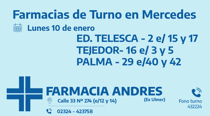 Desde las 8 30 del día de hoy hasta la misma hora de mañana las farmacias de turno en Mercedes son: Eduardo Telesca, Tejedor y Palma.