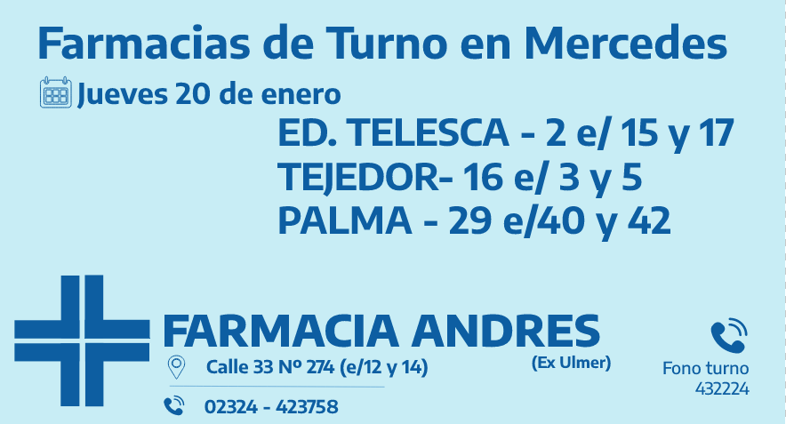Desde las 8:30 del día de hoy hasta la misma hora de mañana, las farmacias de turno en Mercedes son: Eduardo Telesca, Tejedor y Palma.