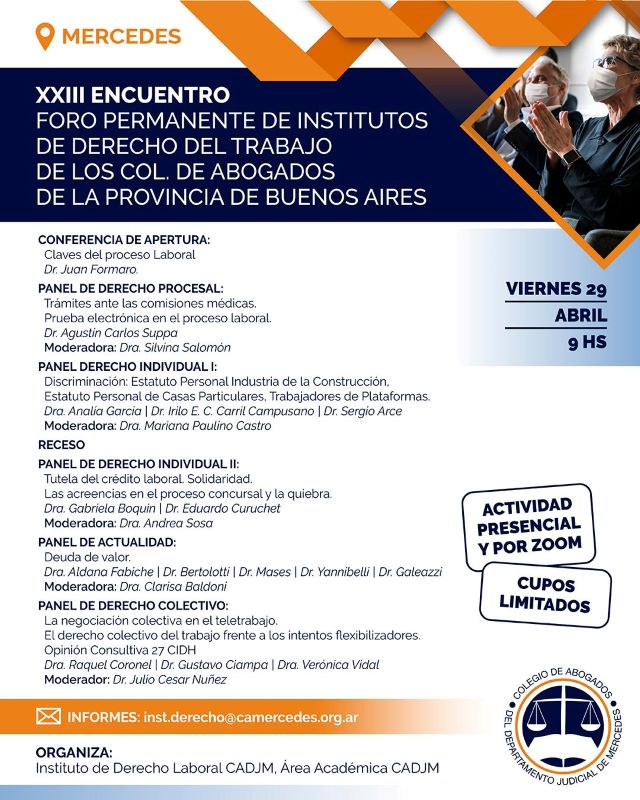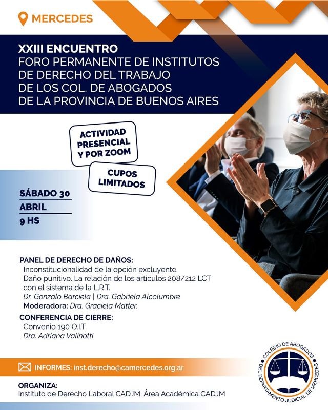 Los días 29 y 30 de abril, el Colegio de Abogados del Departamento Judicial Mercedes llevará adelante el Encuentro del Foro Permanente de Institutos de Derecho del Trabajo que reúne a representante de todos los Colegios de Abogados bonaerenses.