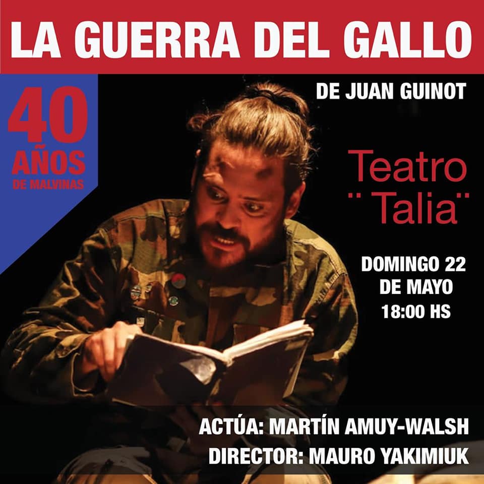 La cartelera del mes que está pronto a iniciarse continúa el domingo 22 de mayo, 18 horas, con la obra escrita por Juan Guinot. En el marco de los 40 años de la Guerra de Malvinas, el actor Martín Amuy-Walsh protagoniza «La Guerra del Gallo».