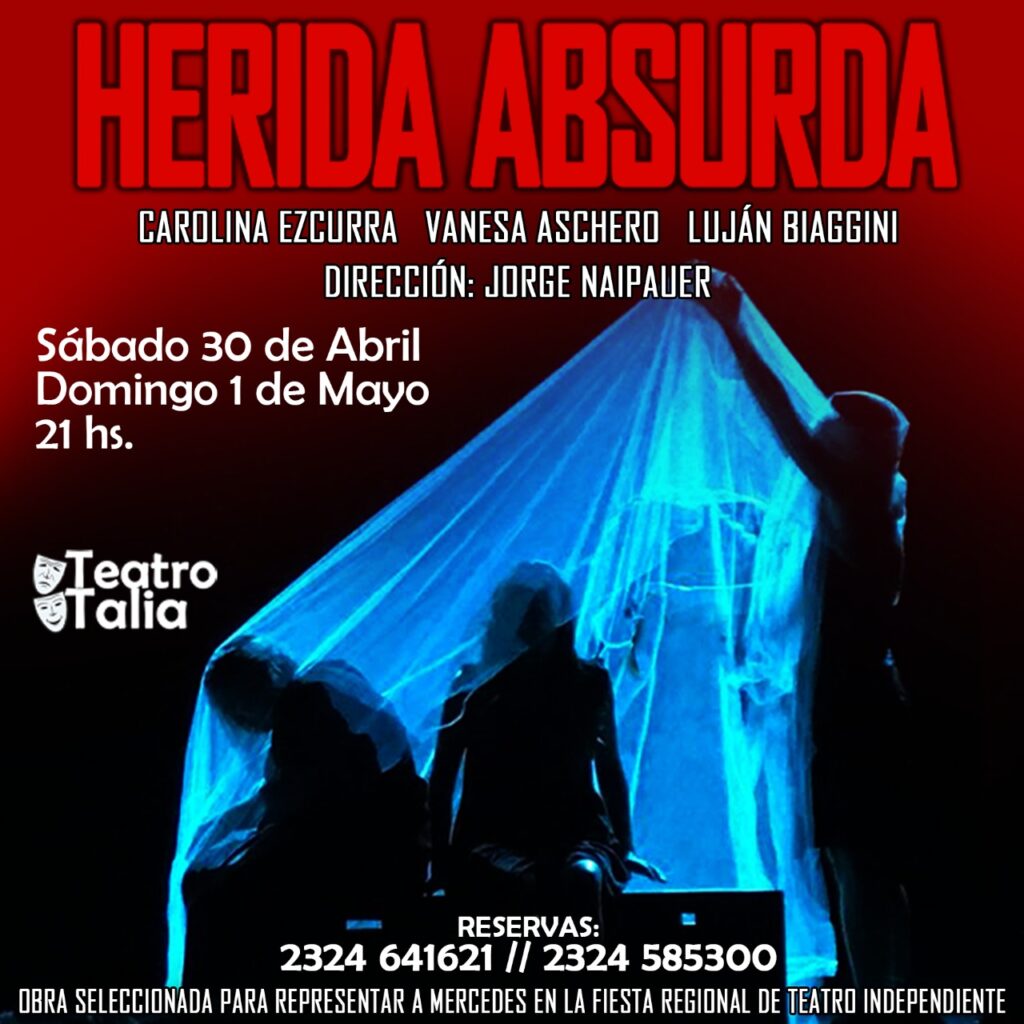 La agenda prevista para el mes de mayo en el Teatro Talía presenta obras con elencos locales e invitados. El próximo fin de semana, sábado 30 de abril y domingo 1 de mayo, ambos días a la hora 21, se presentará el elenco local que integran Carolina Ezcurra, Vanesa Aschero y Luján Biaggini con la dirección de Jorge Naipauer con «Herida Absurda». La obra fue seleccionada para representar a Mercedes en la Fiesta Regional de Teatro Independiente.
