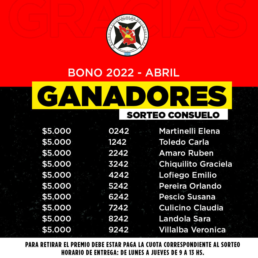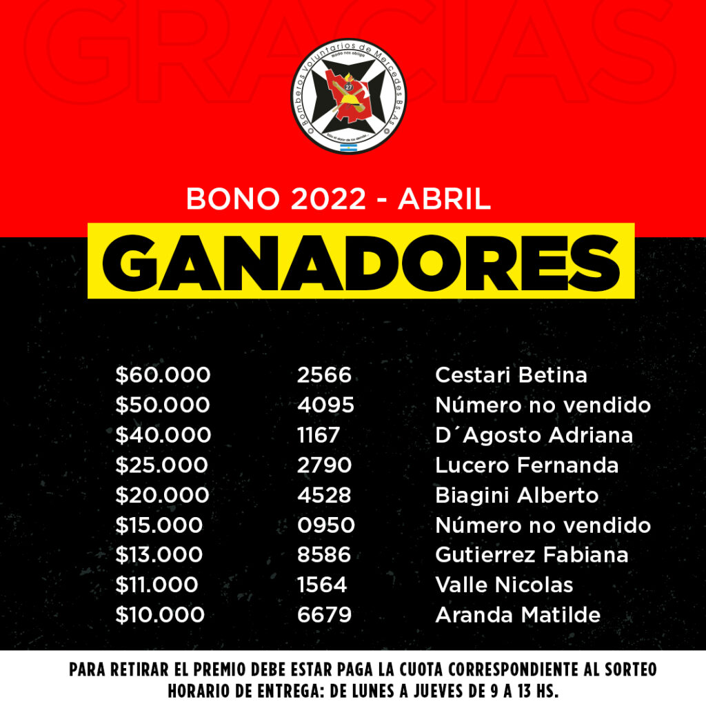 El cuerpo de Bomberos Voluntarios de Mercedes anunció los ganadores del mes de abril de su bono contribución 2022. Para retirar el premio debe estar paga la cuota correspondiente al sorteo. Horario de entrega: de lunes a viernes de 9 a 13 hs.
