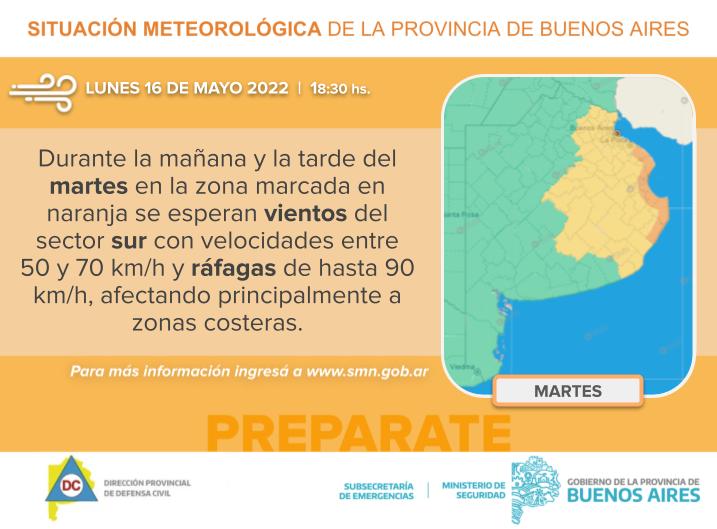 «Tenemos vientos intensos del sur-sudoeste en buena parte de la provincia, con mayor intensidad en el centro y sudeste bonaerense, con ráfagas de 80 y 65 km/h respectivamente, según los registros oficiales del SMN. La velocidad del viento va mermar un poco durante la noche, aunque va a quedar ventoso con ráfagas. Desde la mañana temprano de mañana martes nuevamente tendremos un importante incremento del viento con velocidades mayores a las de hoy, en especial sobre zonas costeras desde Mar del Plata hasta Punta Indio, pudiendo alcanzar y superar los 80 km/h de ráfagas. El viento irá disminuyendo hacia la noche del martes y la madrugada del miércoles», informaron desde la Municipalidad de Mercedes.