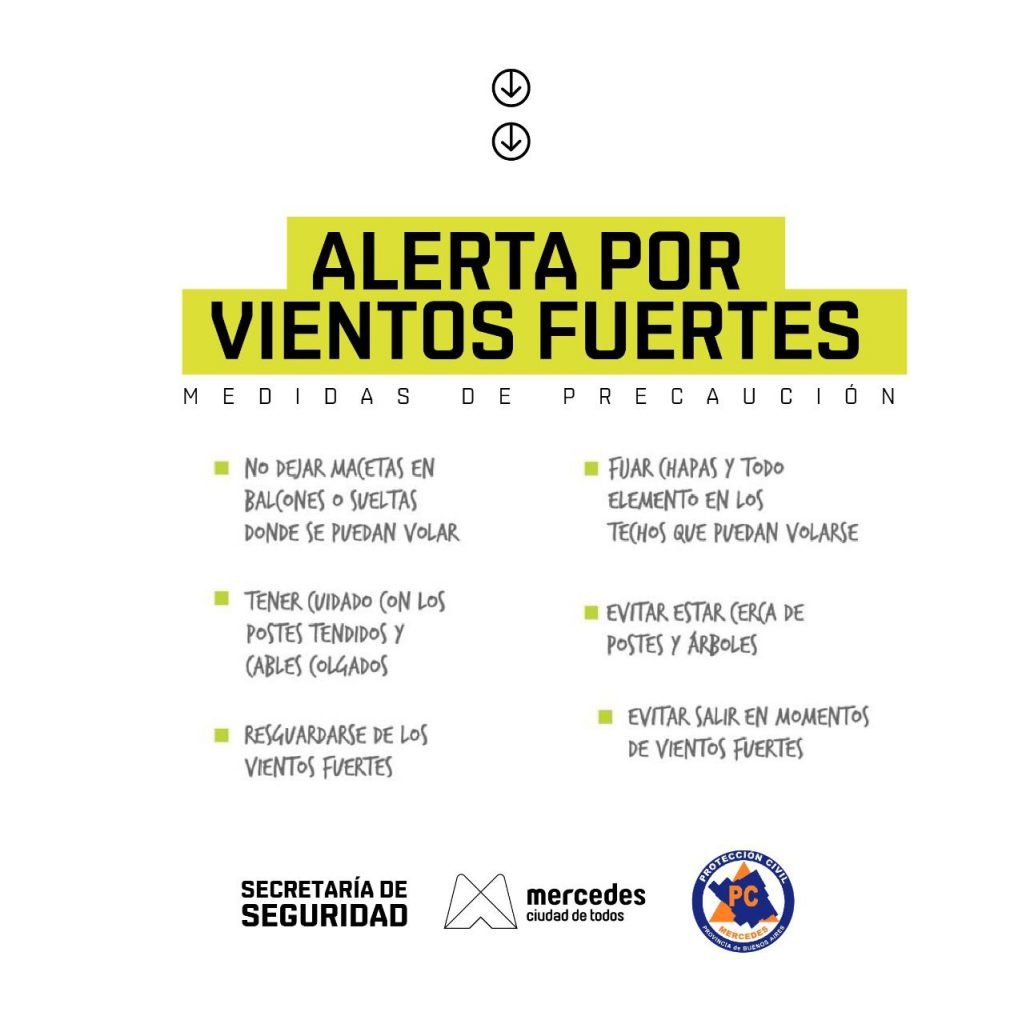 Desde el área de Seguridad y Protección Civil de Mercedes alertan que durante la noche del lunes y madrugada del martes habrá vientos fuertes. Es así que recomiendan a los vecinos tomar medidas de precaución y comunicarse con el 147 en caso de necesitar ayuda de la Comuna.