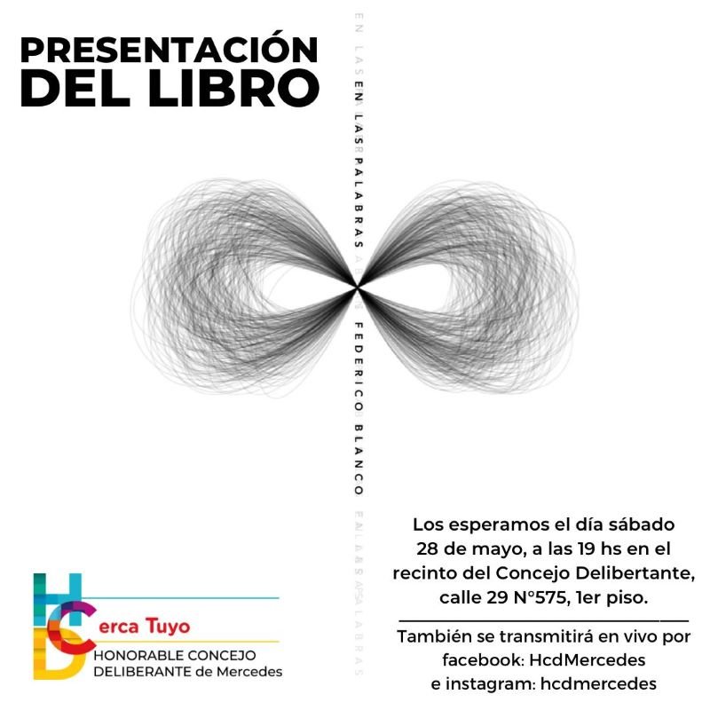En la tarde del sábado 28 de mayo, el joven escritor mercedino Federico Blanco estará presentando su libro «En Las Palabras». A partir de la hora 19 será en el salón del Concejo Deliberante de Mercedes, primer piso del Palacio Municipal.