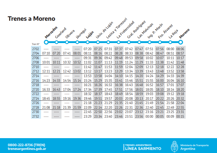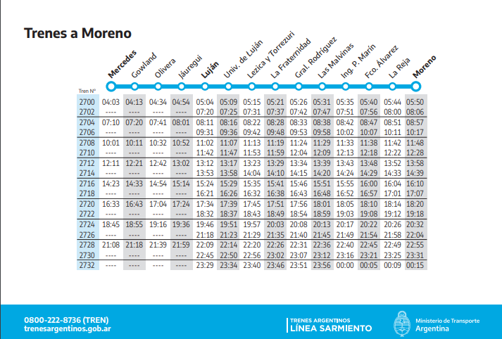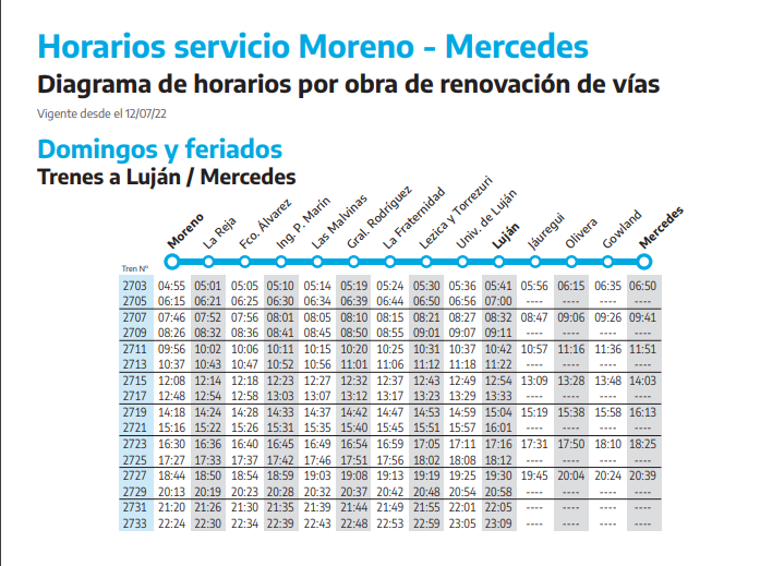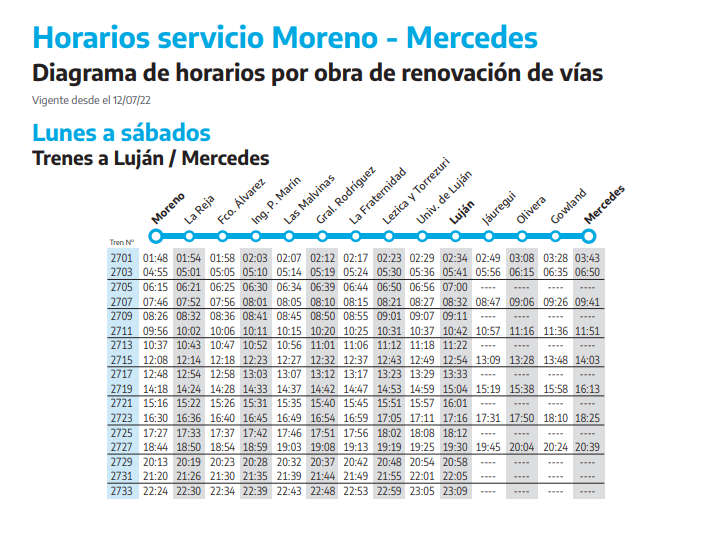 Desde este martes 12 de julio, el ramal del Tren Sarmiento que une a Moreno con Mercedes cambia sus horarios debido a unas obras de renovación en las vías. Esto implica una reducción de 18 a 17 en los recorridos totales durante los días hábiles desde Moreno, lo cual impactará de forma más notoria en horas de la madrugada.