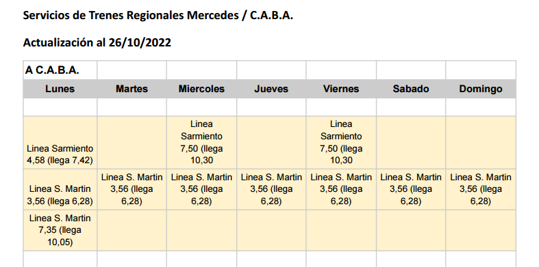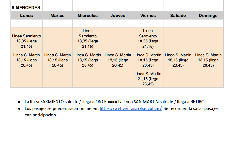 Los trenes que proceden desde la localidad de Bragado con arribo a la ciudad de Buenos Aires suman una parada en la estación de Mercedes del ferrocarril Sarmiento. Serán los viernes a la mañana, y los miércoles a la tarde desde CABA. Los horarios de los servicios comienzan a regir el 26 de octubre.