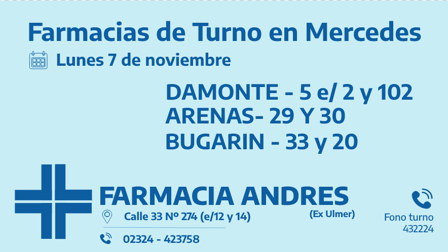 Desde las 8:30 del día de hoy hasta la misma hora de mañana, las farmacias de turno en Mercedes son: Damonte, Arenas y Bugarín.