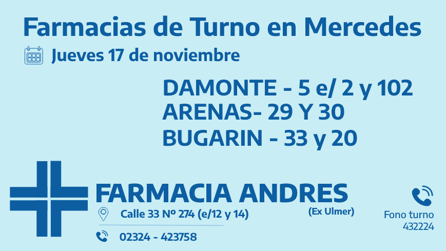 Desde las 8:30 del día de hoy hasta la misma hora de mañana las farmacias de turno en Mercedes son: Damonte, Arenas y Bugarin