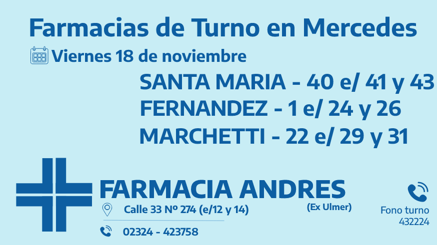 Desde las 8:30 del día de hoy hasta la misma hora de mañana, las farmacias de turno en Mercedes son: Santa María, Fernández y Marchetti