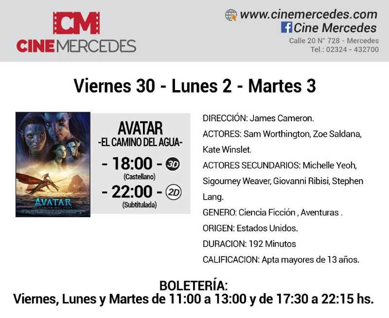 La secuela de una de las películas fantásticas más aclamada y vista, sigue en la cartelera del Cine Mercedes. «Avatar, el Camino del Agua» puede verse los días viernes 30 de diciembre, y lunes 2 y martes 3 de enero, a las 18 y 22 horas.