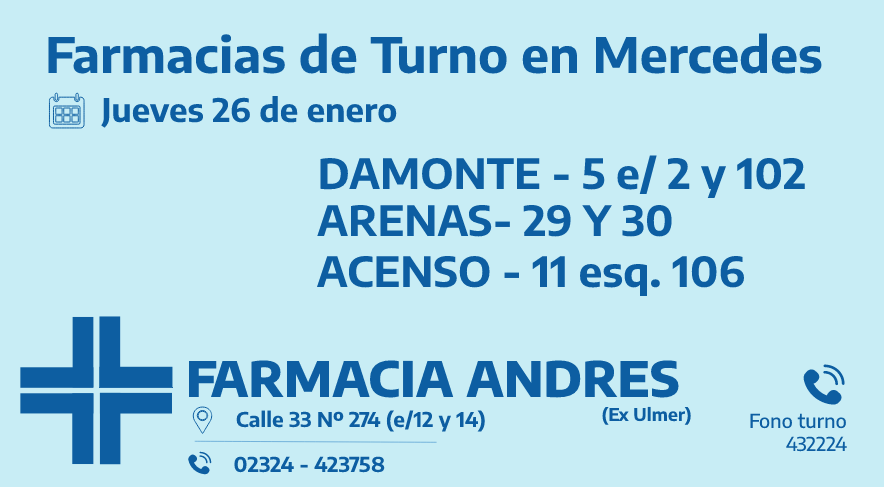 Desde las 8:30 del día de hoy hasta la misma hora de mañana, las farmacias de turno en Mercedes son: Damonte, Arenas y Acenso.