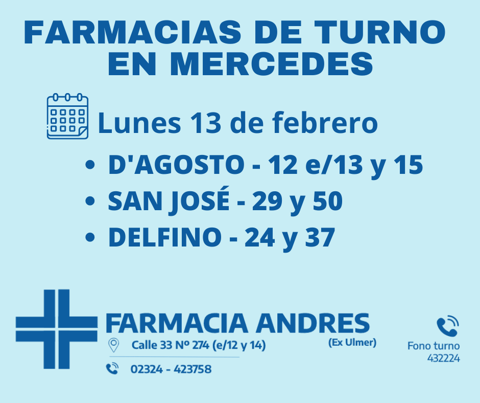 Desde las 8 30 del día de hoy hasta la misma hora de mañana las farmacias de turno en Mercedes son: D’Agosto, San José y Delfino