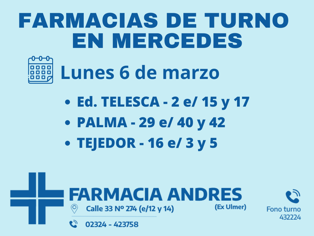 Desde las 8 30 del día de hoy hasta la misma hora de mañana las farmacias de turno en Mercedes son Eduardo Telesca, Tejedor y Palma.