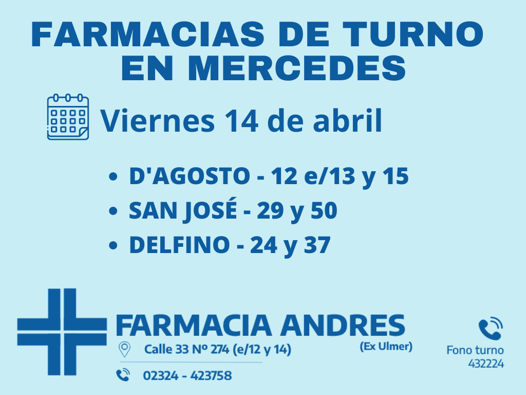 Desde las 8:30 del día de hoy hasta la misma hora de mañana las farmacias de turno en Mercedes son D’Agosto, San José y Delfino.