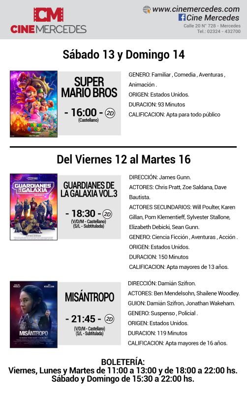 La película del director de Los Simuladores y Relatos Salvajes vuelve a la pantalla grande con una película de producción internacional, con suspenso y acción. Hasta el martes 16 de mayo se podrá ver Misántropo en las funciones de 21:45 hs. Continúan en cartelera Super Mario Bros y Guardianes de la Galaxia vol 3.