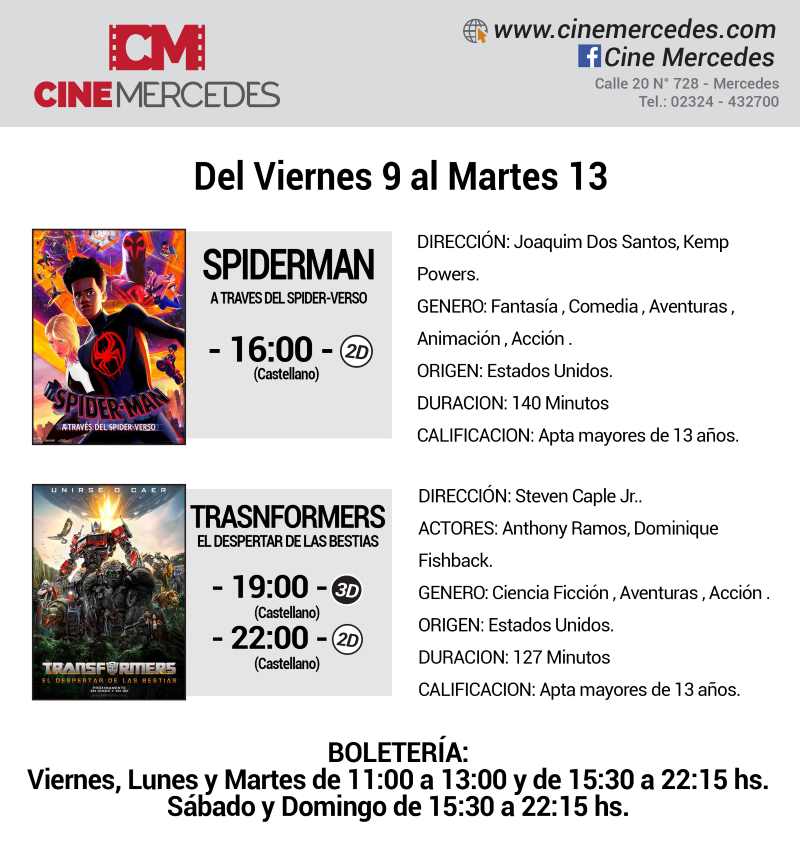 Desde el viernes 9 al martes 13 de junio, el Cine Mercedes presenta dos películas en la gran pantalla. La versión animada de «Spiderman. A través del spider-verso» podrá verse a la hora 16. Mientras que una nueva de Transformers estará a las 19 y a las 22.
