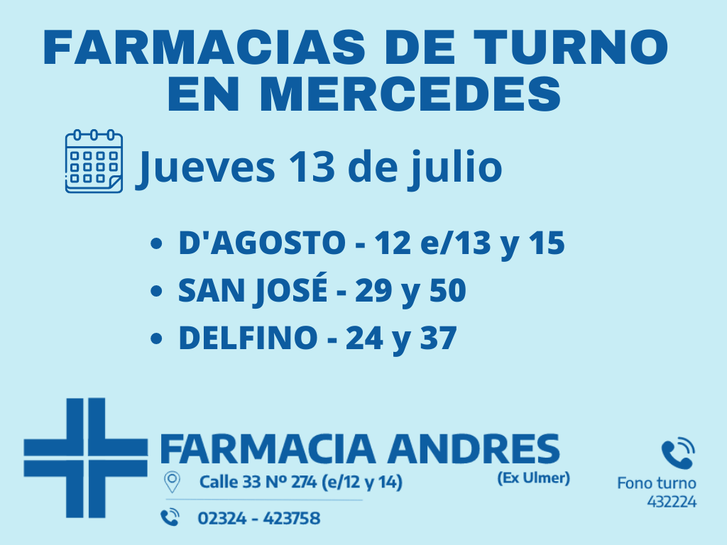 Desde las 8:30 del día de hoy hasta la misma hora de mañana, las farmacias de turno en Mercedes son: D’Agosto, San José y Delfino.