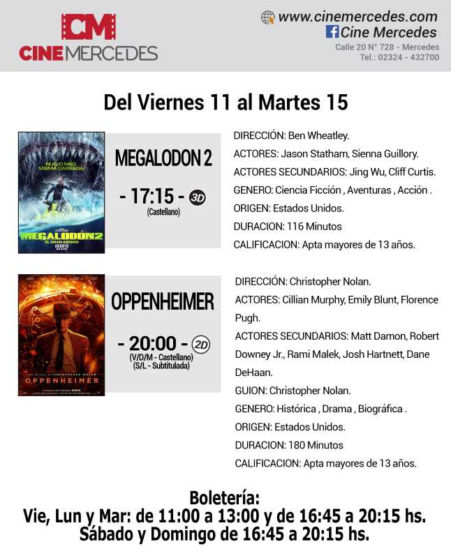 Desde el viernes 11 al martes 15 de agosto, el Cine Mercedes presentará dos películas aclamadas por el público. Llega como estreno la segunda parte de Megalodón en las funciones de las 17:15; mientras que continúa una semana más la biopic Oppenheimer en la función de la hora 20.