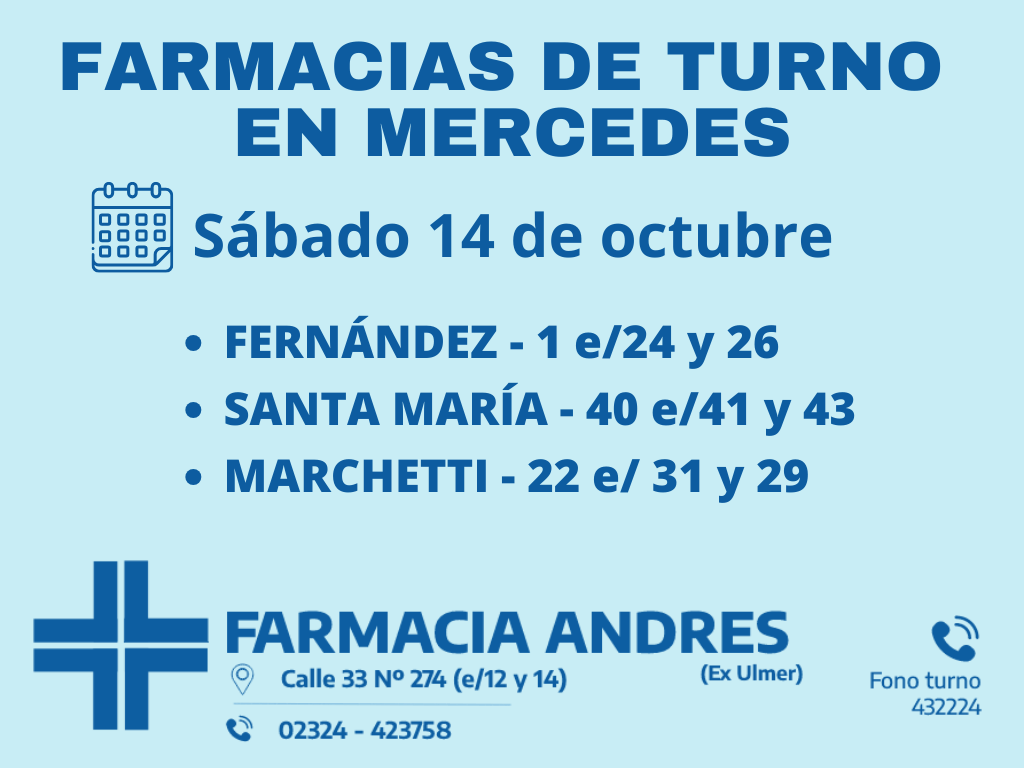 Desde las 8 30 del día de hoy hasta la misma hora de mañana las farmacias de turno en Mercedes son Fernández, Santa María y Marchetti