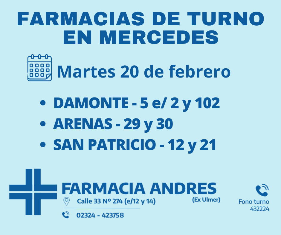 Desde las 8 30 del día de hoy hasta la misma hora de mañana las farmacias de turno en Mercedes son Damonte, Arenas y San Patricio