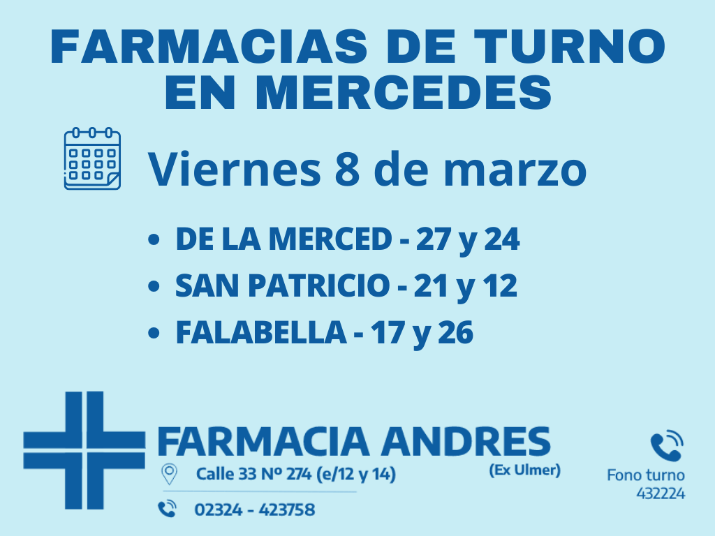 Desde las 8 30 del día de hoy hasta la misma hora de mañana las farmacias de turno en Mercedes son De la Merced, San Patricio y Falabella.