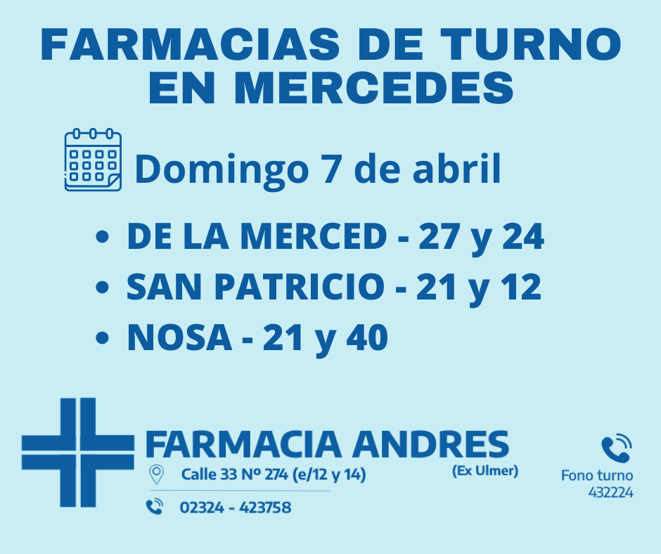 Desde las 8 30 del día de hoy hasta la misma hora de mañana las farmacias de turno en Mercedes son De la Merced, San Patricio y Nosa.