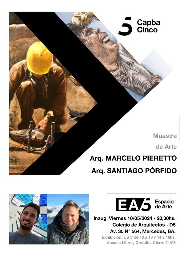 El próximo viernes 10 de mayo, en el Colegio de Arquitectos de Mercedes se inaugura una nueva muestra de arte. A partir de las 20:30 hs, en la sede local de la institución (Av. 30 N° 564, Mercedes) se presentarán las obras de los arquitectos y artistas: Santiago Pórfido de Mercedes y Marcelo Pieretto de Pilar.