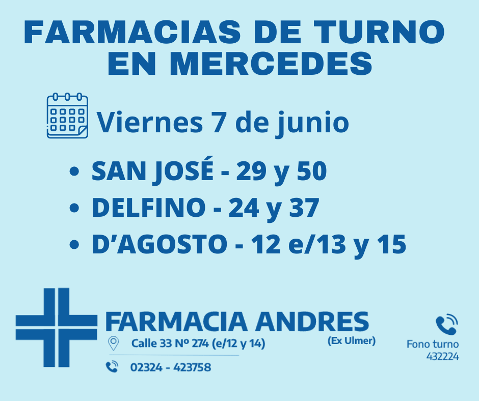 Desde las 8:30 del día de hoy hasta la misma hora de mañana, las farmacias de turno en Mercedes son: San José, Delfino y D’Agosto.