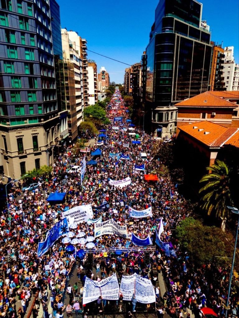 La imagen de la Capital Federal se repitió en todas las provincias. En algunas fue nuevamente impresionante, como en Mendoza, tierra que gobierna el radicalismo – pro, Usuhaia, entre otras, donde las y los estudiantes, docentes, no docentes y ciudadanía dijo sí al financiamiento educativo y no al veto que Milei quiere ejecutar contra la ley de financiamiento universitario.