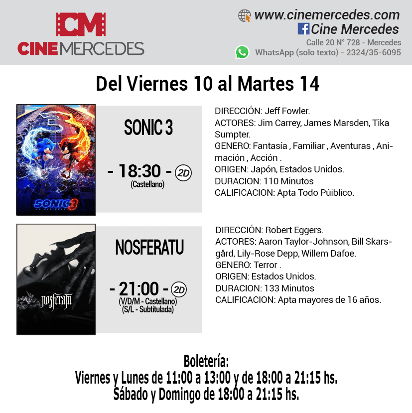 El Cine Mercedes presenta dos películas en su pantalla. Estrena en la sala local «Nosferatu» y su ambiente gótico y terror. En tanto, para los más pequeños continúa «Sonic 3».
