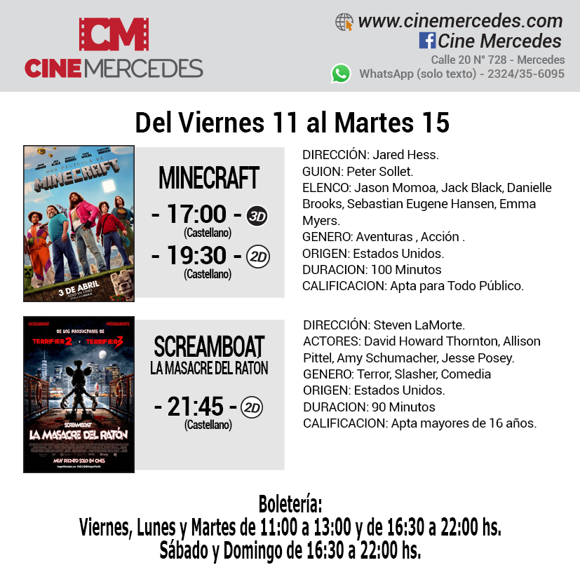 Desde el viernes 11 al martes 15 de abril, el Cine Mercedes presenta dos películas con acción y terror. Continúa Minecraft en dos funciones diarias, mientras que se estrena en la pantalla local «Screamboat: La Masacre del Raón».