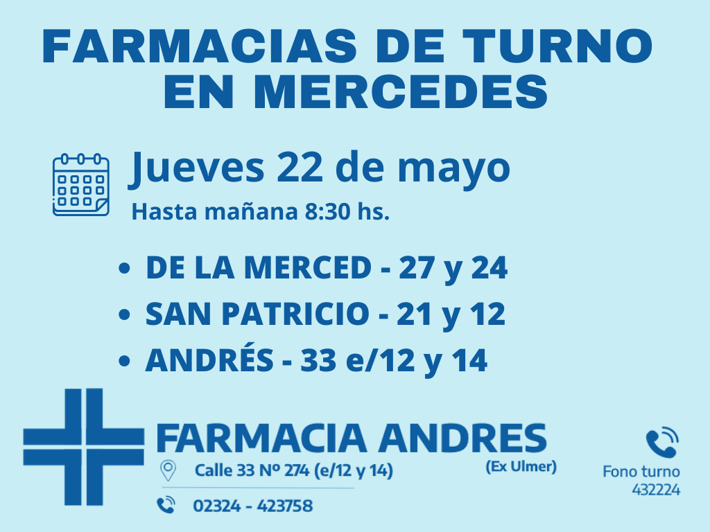 Desde las 8:30 del día de hoy hasta la misma hora de mañana, las farmacias de turno en Mercedes son: San Patricio y Andrés. A último momento se informó que De La Merced no podrá hacer su turno y por lo tanto, la hará Tiseyra.