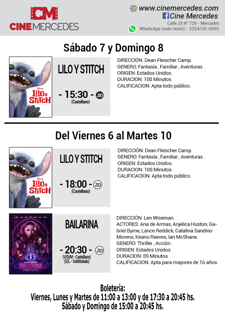 Desde el viernes 6 al martes 10 de junio, el Cine Mercedes presentará en la pantalla local Lilo y Stitch que sigue por tercera semana consecutiva y estrena Bailarina en la función de las 20:30 hs.