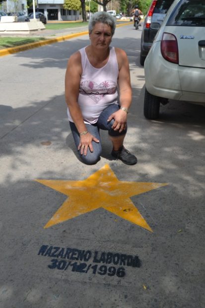 La tercera estrella amarilla se pintó en la mañana de este jueves. En esta oportunidad, se pintó en la avenida 16 a pocos metros de la calle 19 y se hizo recordando a Nazareno Laborda, un pequeño de 7 años que hace veinte iba a la Casa del Niño con sus hermanos en bicicleta y un vehículo embistió su vida. Con el fin de que la gente tome conciencia y respete las normas de tránsito, se pintó una estrella amarilla y se colocó un jacarandá en el boulevard a pocos metros.