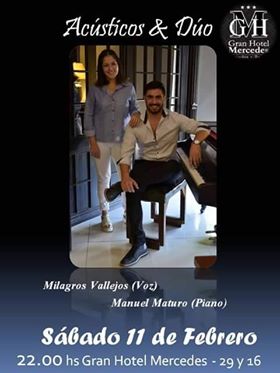 El venidero sábado 11 de febrero se llevará un especial concierto con la voz de Milagros Vallejos y el piano de Manuel Maturo. Recorrerán los mejores temas del rock nacional e internacional, además de algunos temas musicales de distintas naciones. La propuesta será una cena – show acústica a partir de la hora 22 en el Gran Hotel Mercedes.