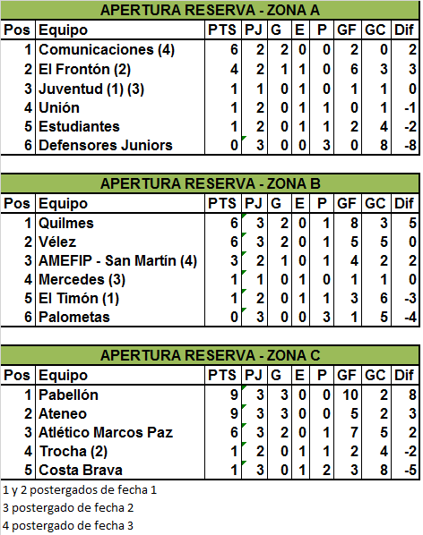 Con el faltante del partido entre Comunicaciones y AMEFIP San Martín, se jugó la tercera fecha del torneo de Reserva de la Liga Mercedina de Fútbol, en la que debutaron Club Mercedes y Juventud, ambos con empates. Además, Quilmes venció a Trocha, Pabellón a Palometas y Marcos Paz a Vélez.
