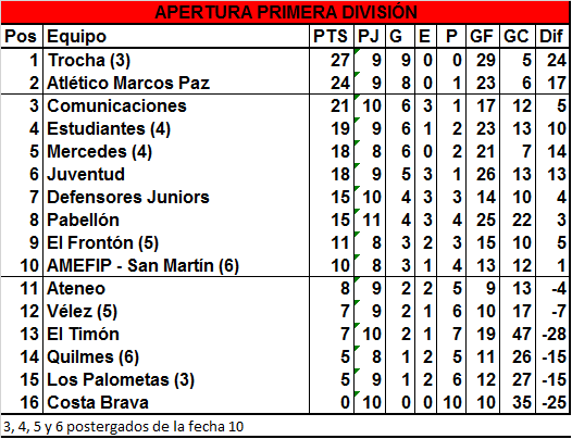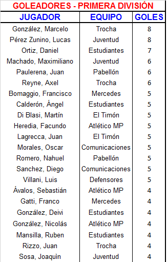 | Trocha | 5 | Marcelo González 2, Juan Rizzo, Hernán Bruno y Sebastián Gómez para Trocha |