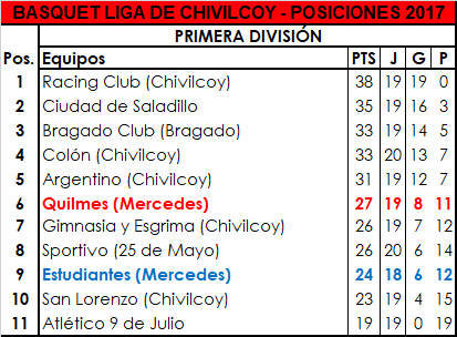En la noche del lunes se jugaron dos partidos por el torneo de Primera División de la Asociación de Básquet de Chivilcoy. En el gimnasio «Fernando Cardinal», por la 21° fecha, Quilmes superó a Argentino por 81-74, en tanto que adelantando el juego correspondiente a la 22° fecha (última de la ronda regular), el equipo de Deportivo Colón superó como visitante a Sportivo 25 de Mayo por 90-64. para medirse con Sportivo.